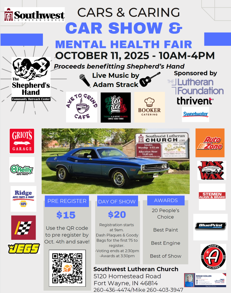 Join us October 11, 2025 for Cars & Caring! Show Cars, Mental Health Fair, food, live music, creation marketplace, and family activities are all available.